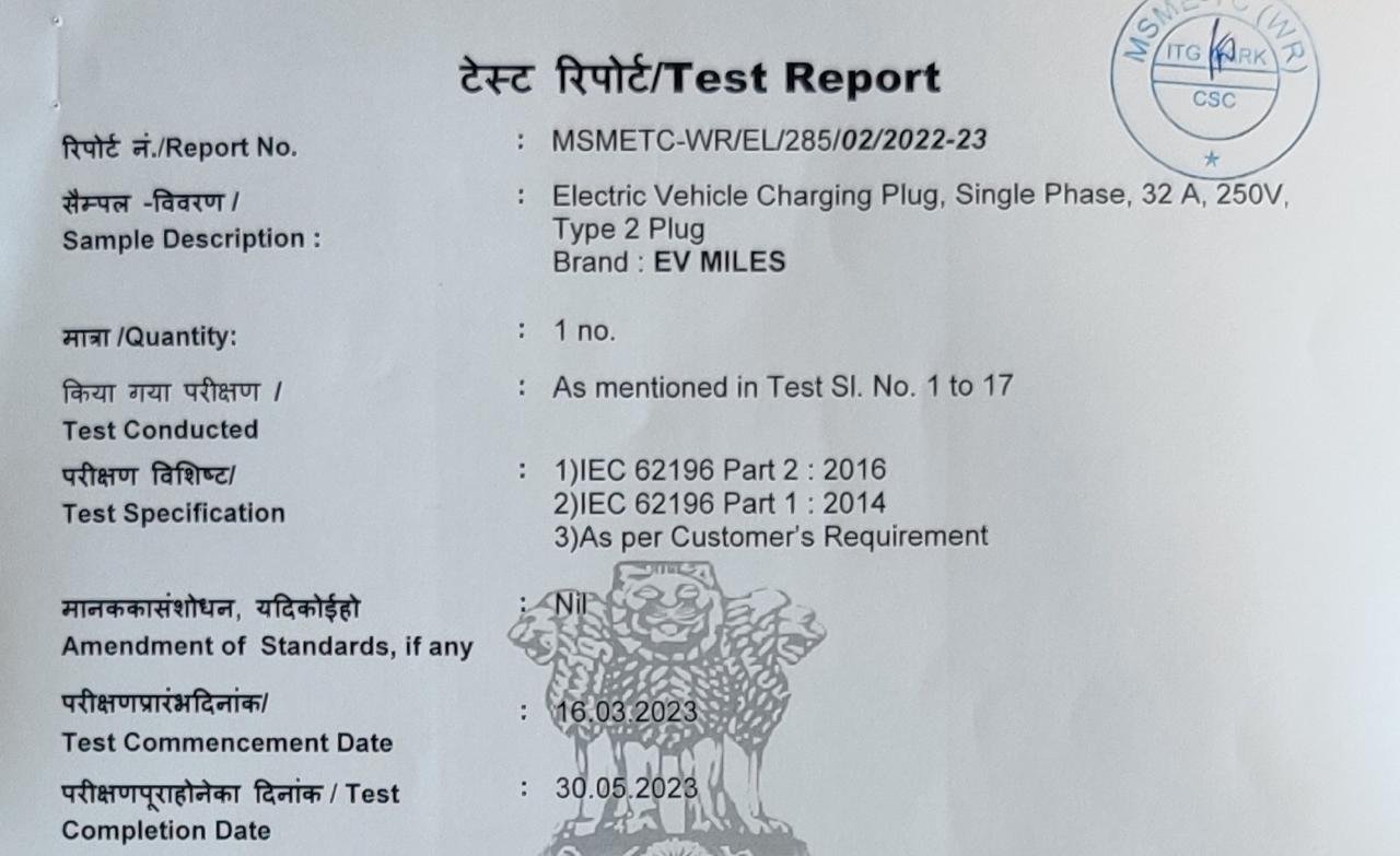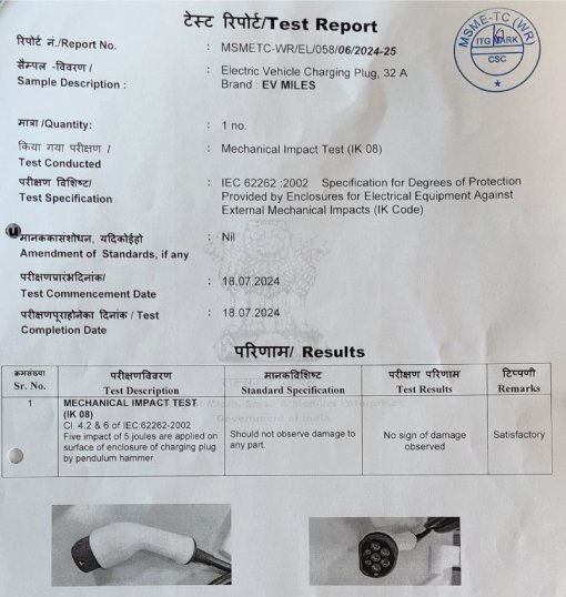 IEC 62196-2 certified by MSME NABL-A Government of India authorized accredited lab